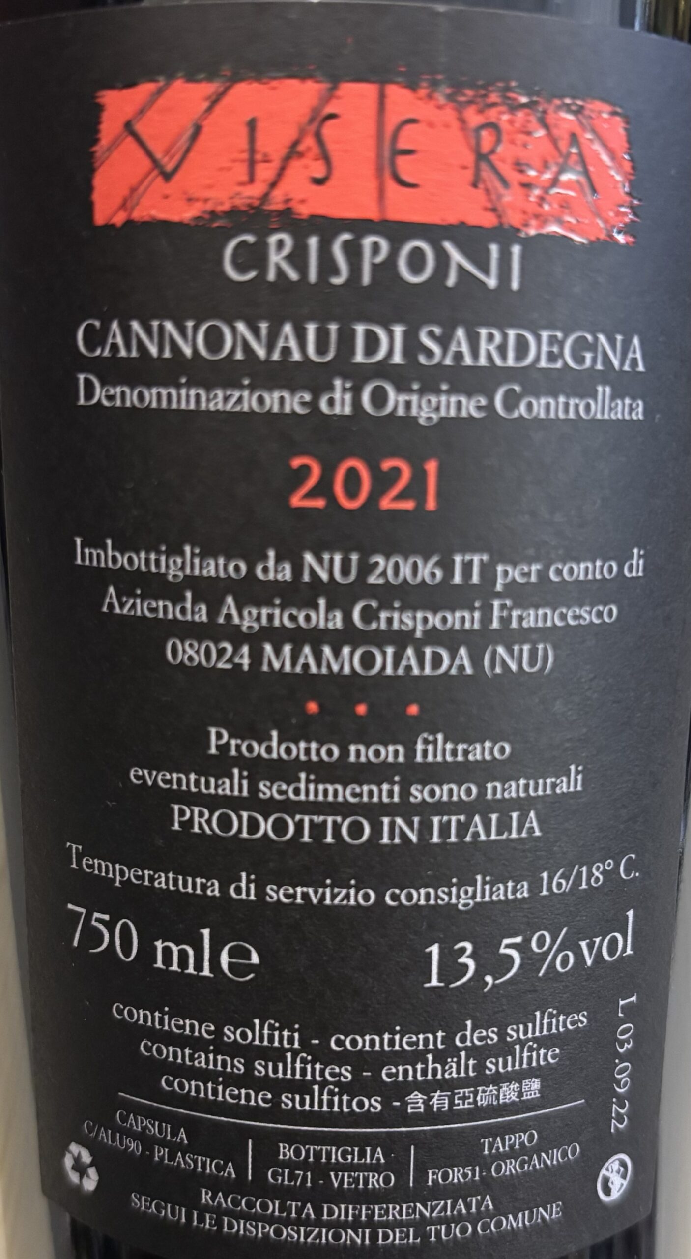 - Vitigno e Denominazione: Il Visera è tipicamente prodotto come Cannonau di Sardegna DOC (o Barbagia IGT), riflettendo l’espressione più autentica del vitigno Cannonau coltivato nei territori di alta collina di Mamoiada.