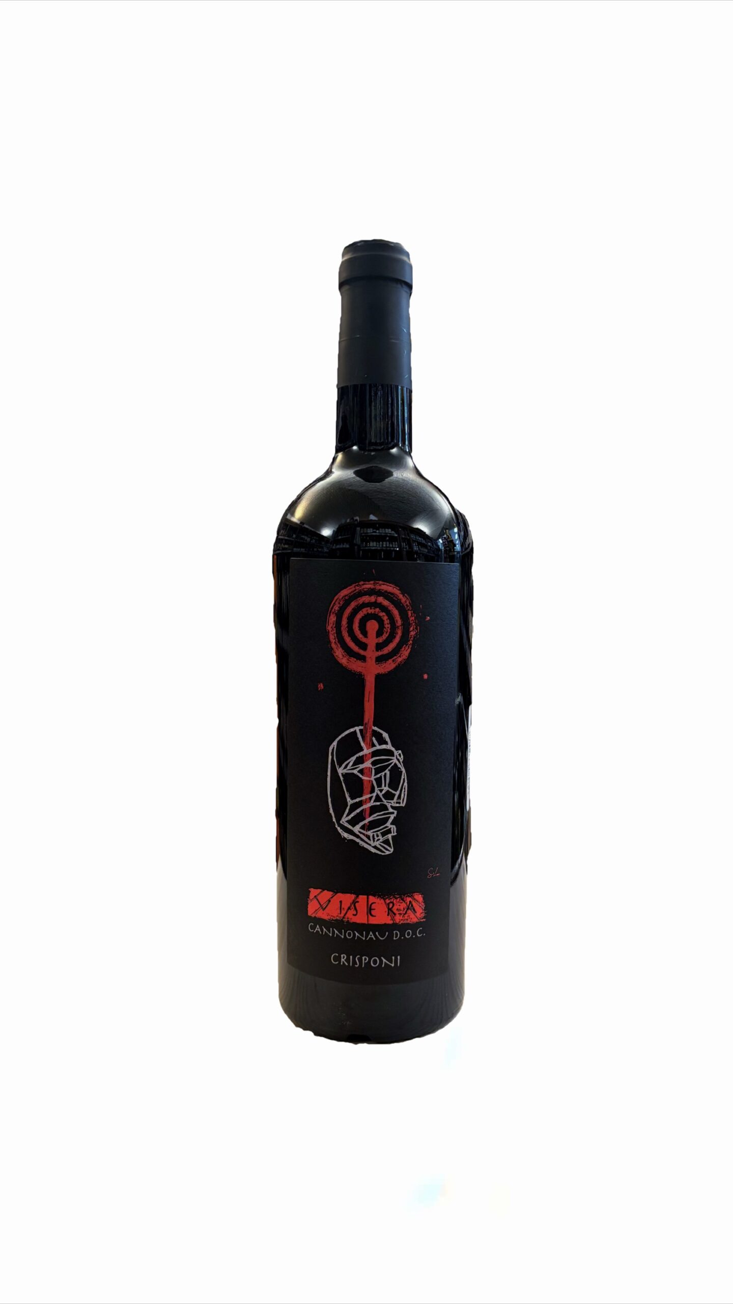 Il nome “Visera” richiama la maschera tradizionale dei Mamuthones. L’estetica della bottiglia è caratterizzata da simboli concentrici che rappresentano la lavorazione della terra e il legame profondo con le tradizioni locali di Mamoiada.